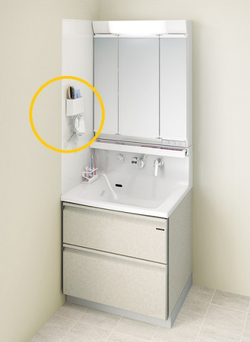 洗面周りの小物をくっつけて、機能的で便利な空間にできるんですよ