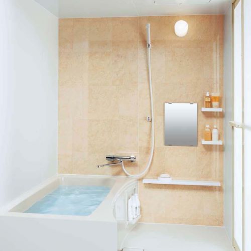 洗面室と浴室の段差を抑える低段差ドアで、浴室出入りがラクになります。一緒に入浴する介助者がサポートしやすく、出入りしやすいゆったりとしたドア幅です。